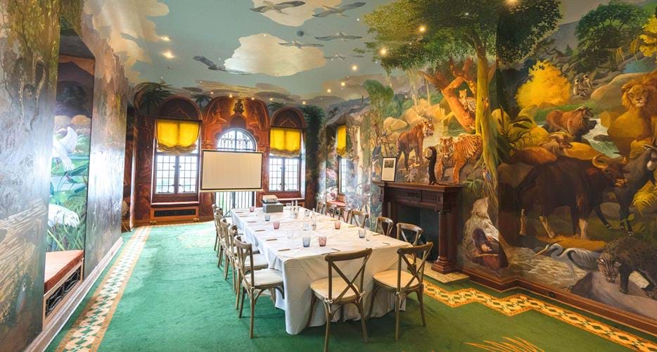 Decorated with Arthur Spencer Roberts’ stunning hand-painted animal murals, this room offers a cosy yet flexible space in the heart of the mansion.
