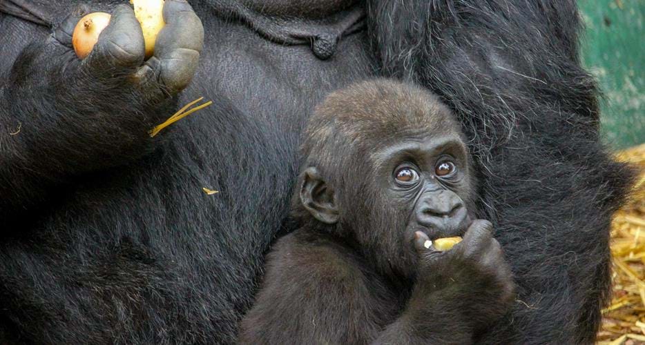 Gorillas live in family groups consisting of one adult male, several adult females and their offspring. Females usually give birth to one baby after a gestation of around 8 ½ months (twins have occurred in captivity). Infants are weaned around 3 years old.